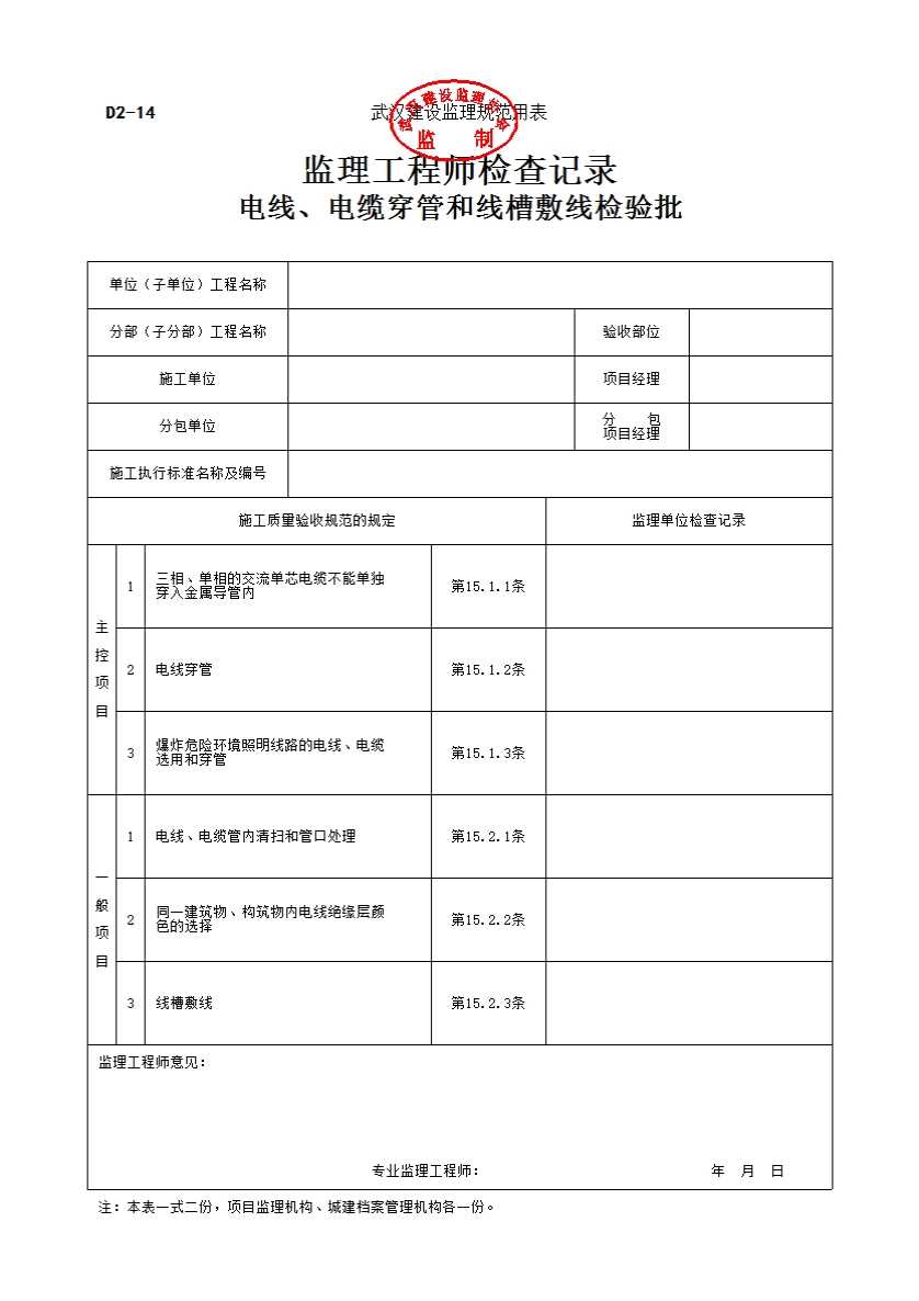 表格名称:D2-14 电线、电缆穿管和线槽敷线检验批监理工程师检查记录
