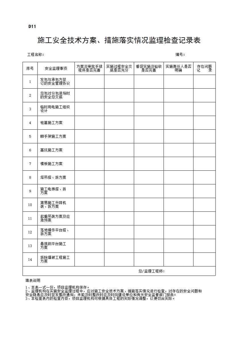 表格名称:D11 施工安全技术方案、措施落实情况监理检查记录表