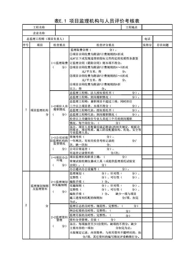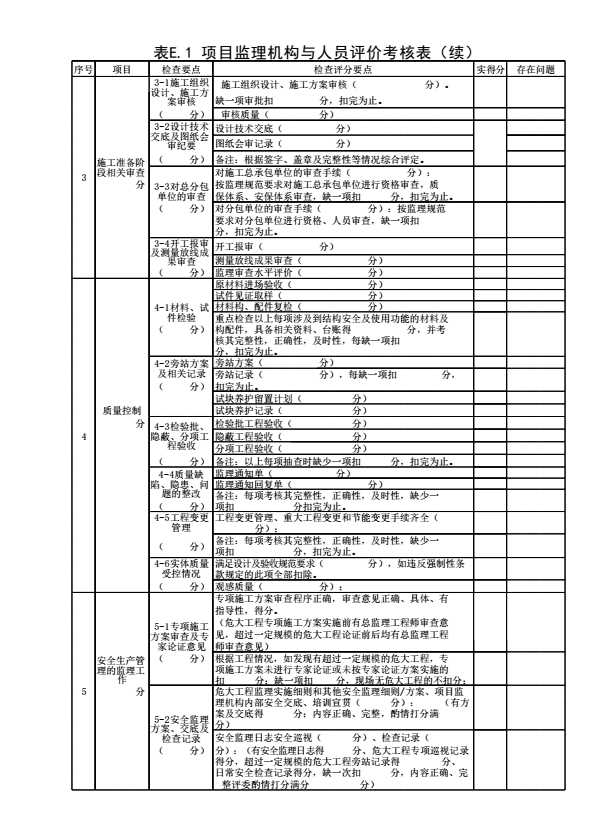 表E.1 项目监理机构与人员评价考核表