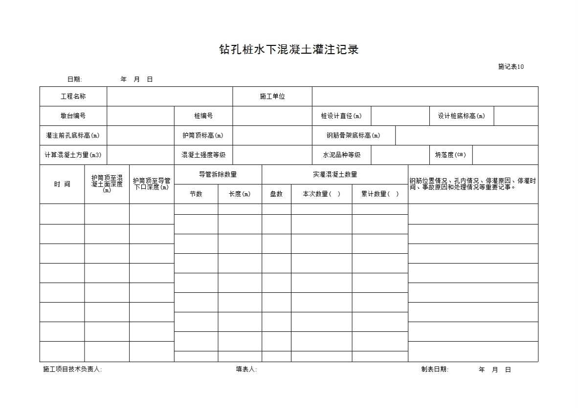 表格名称:施记表10 钻孔桩水下混凝土灌注记录