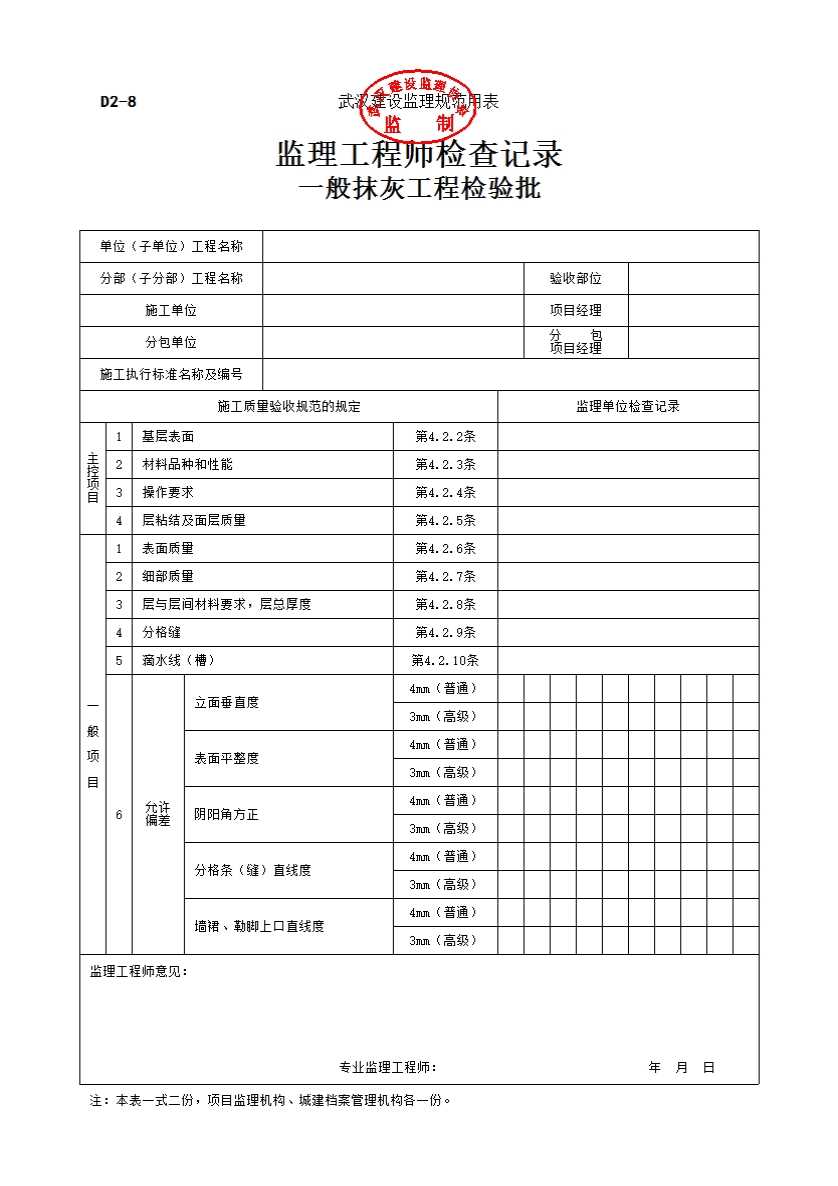表格名称:D2-8 一般抹灰检验批监理工程师检查记录