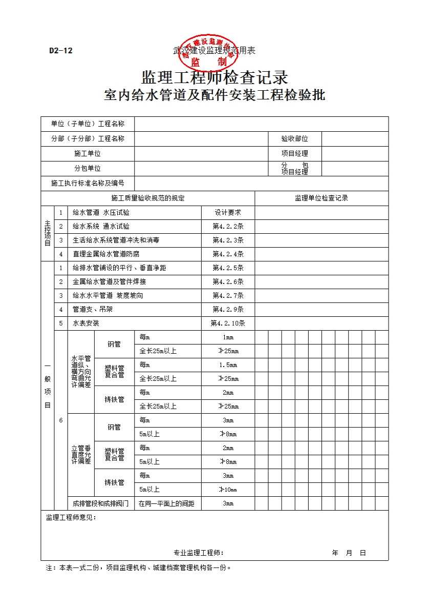 表格名称:D2-12 室内给水管道及配件安装检验批监理工程师检查记录