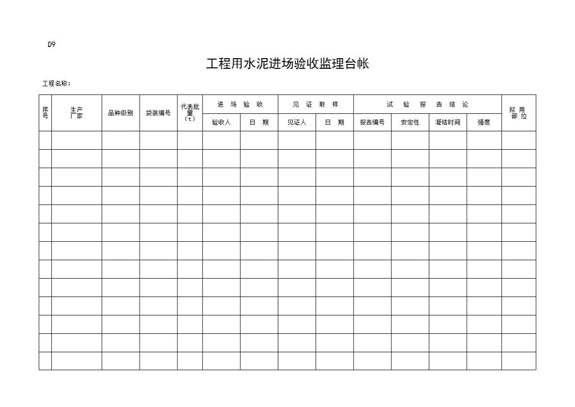表格名称:D9 工程用水泥进场验收监理台帐