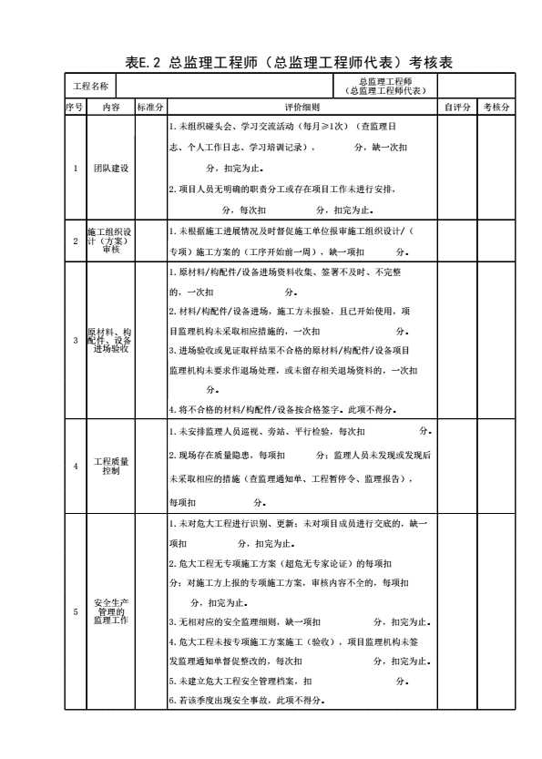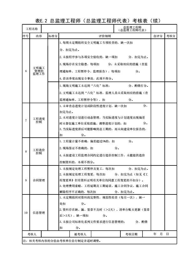 表E.2 总监理工程师(总监理工程师代表)考核表