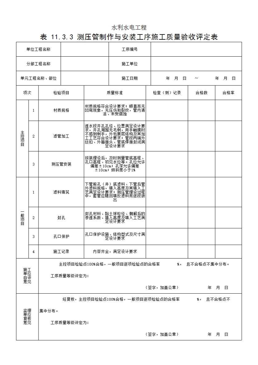 表格名称:表 11.3.3 测压管制作与安装工序施工质量验收评定表
