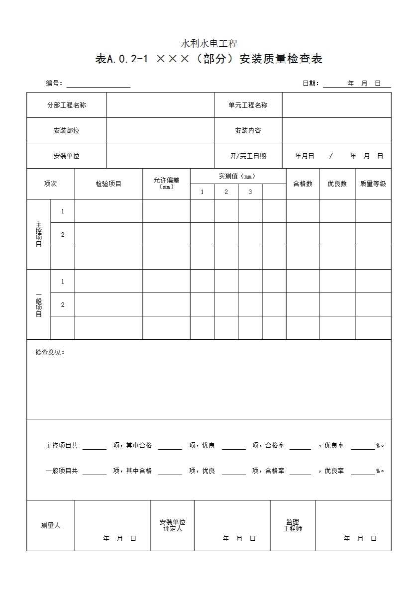 附录A 单元工程安装质量验收评定表急安装质量检查表(样式)
