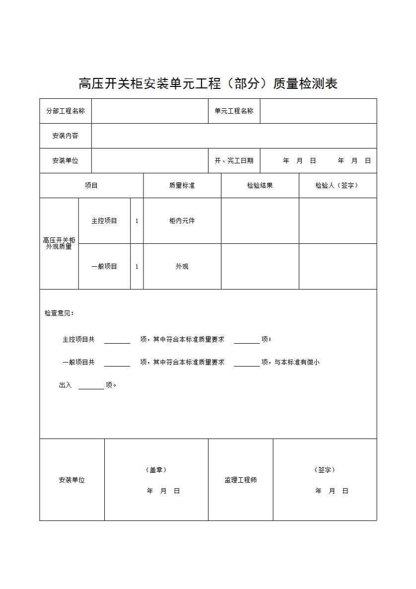 表格名称:高压开关柜安装单元工程(部分)质量检测表1
