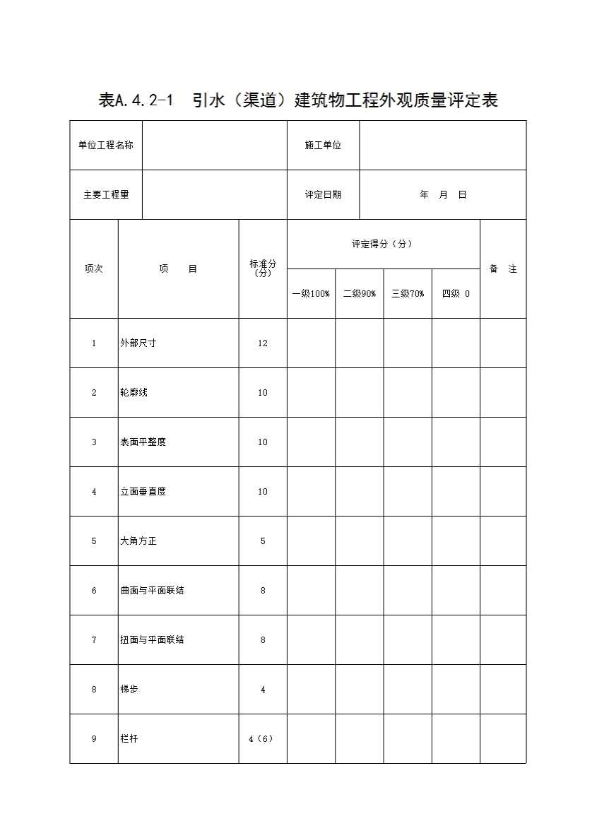 表格名称:表A.4.2-1 引水(渠道)建筑物工程外观质量评定表