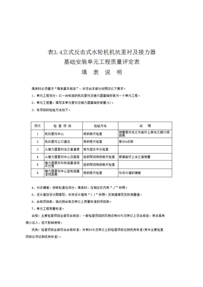 表格名称:表3.4 立式反击式水轮机机坑里衬及接力器基础安装单元工程质量评定表