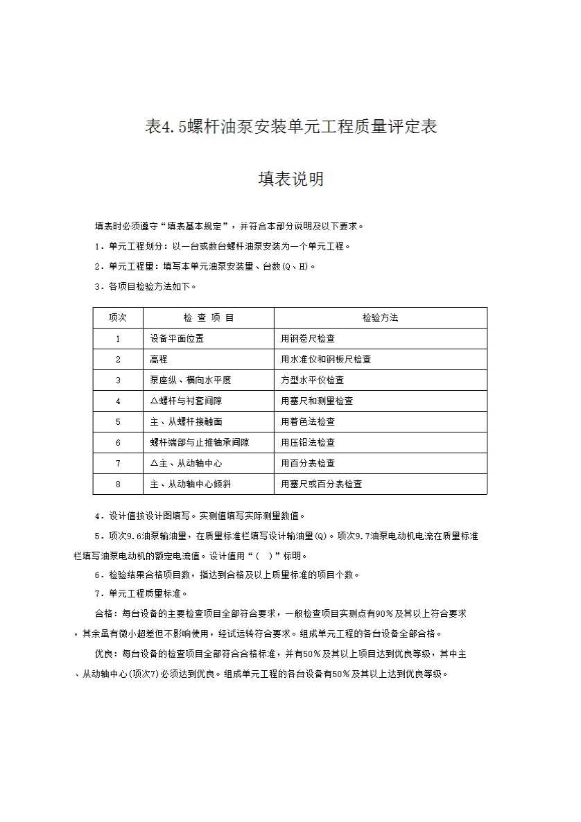 表格名称:表4.5 螺杆油泵安装单元工程质量评定表