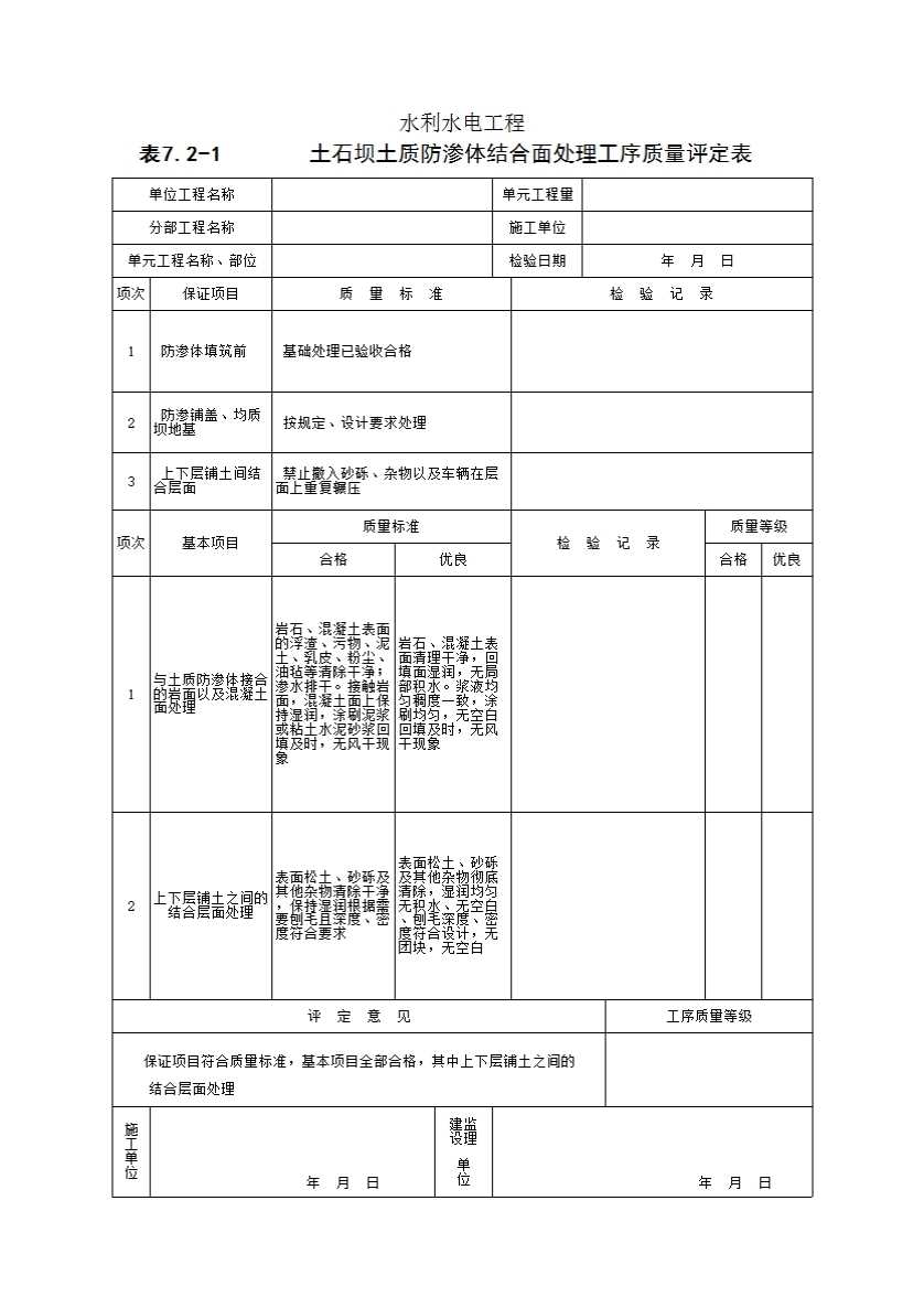 表7.2-1 土石坝土质防渗体结合面处理工序质量评定表