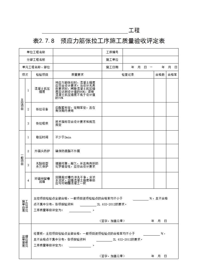 表2.7.8 预应力筋张拉工序施工质量验收评定表填表要求