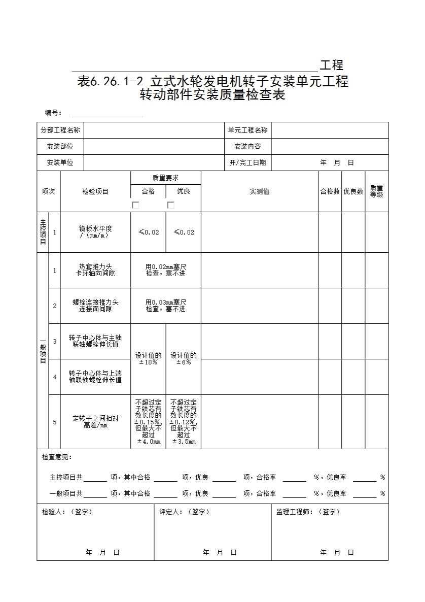 表格名称:表6.26.1-2 立式水轮发电机转子安装单元工程转动部件安装质量检查表
