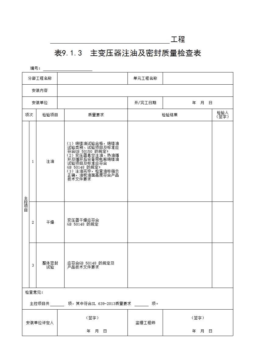 表格名称:表9.1.3 主变压器注油及密封质量检查表