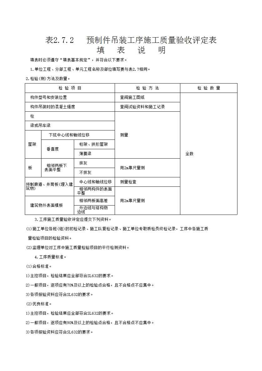 表2.7.2 预制件吊装工序施工质量验收评定表