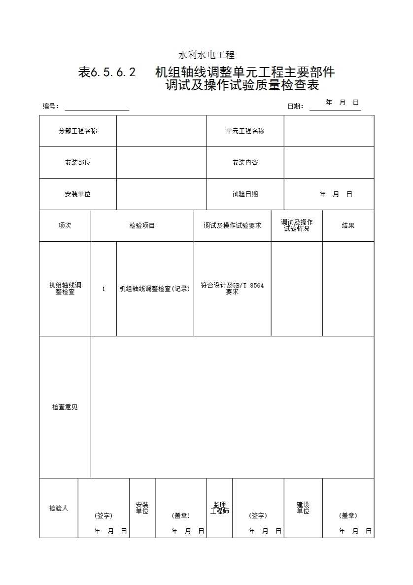 表格名称:表6.5.6.2 机组轴线调整单元工程主要部件调试及操作试验质量检查表
