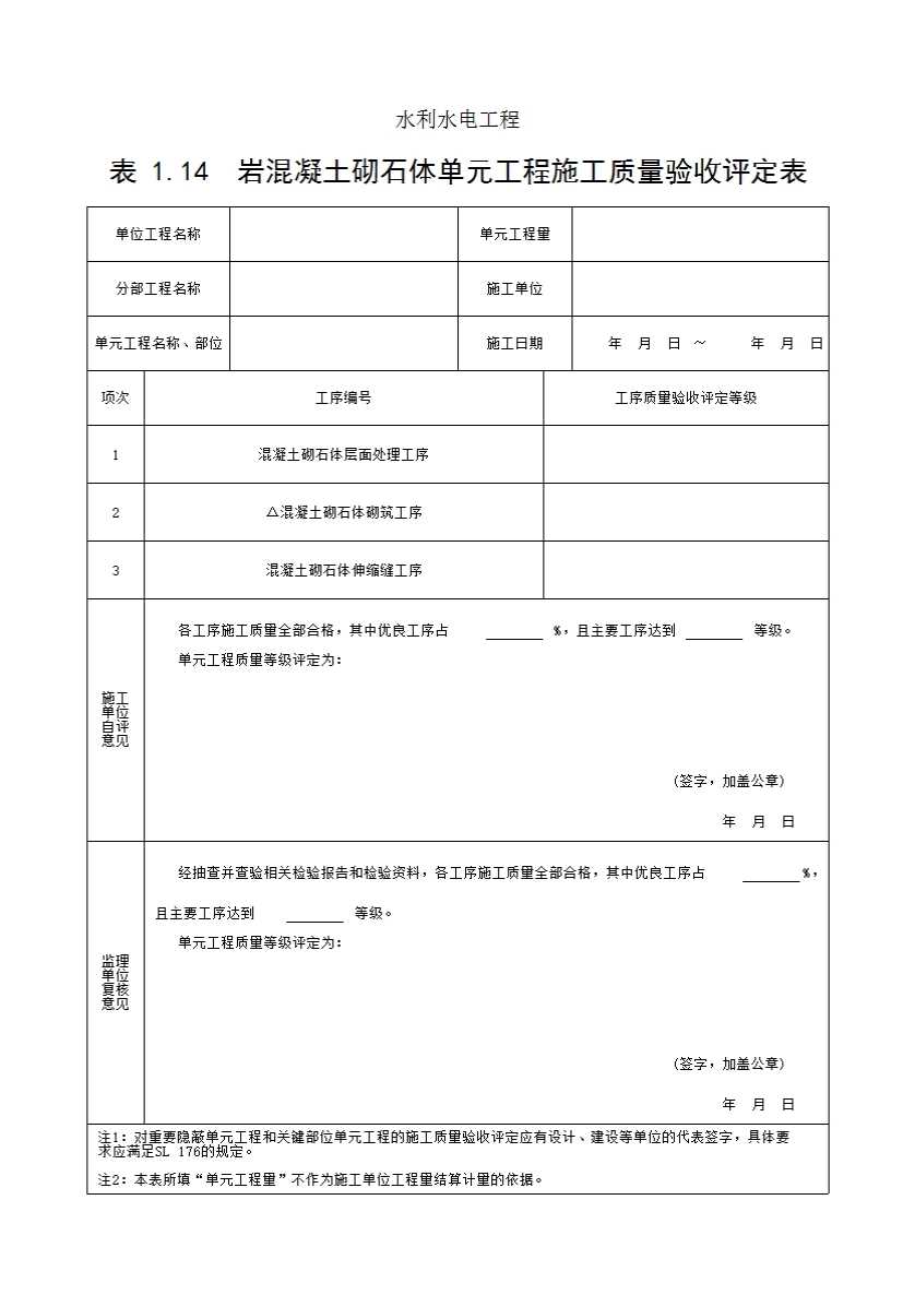 表格名称:表1.14 混凝土砌石体单元工程施工质量验收评定表