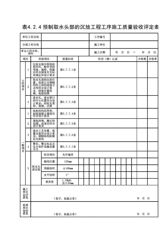 表格名称:4.2.4 预制取水头部的沉放工程工序施工质量验收评定表