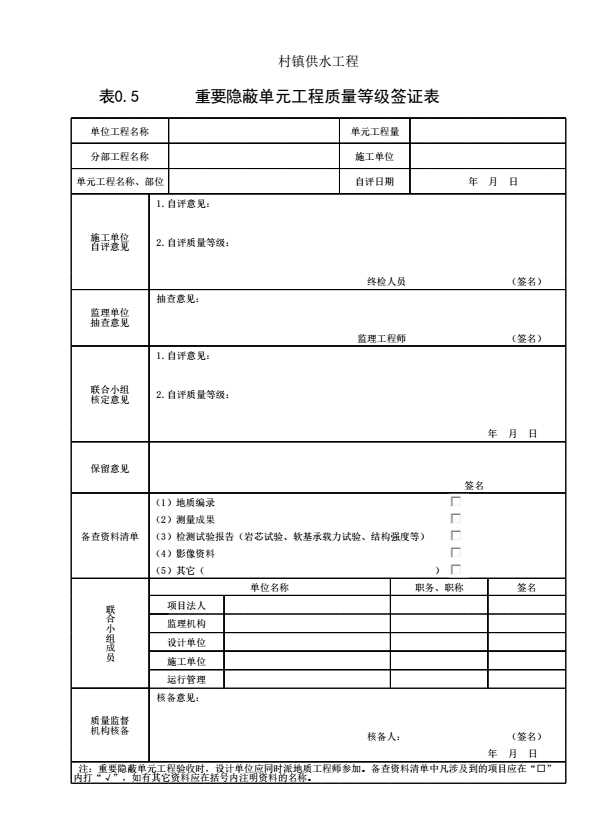 表格名称:表0.5 重要隐蔽单元工程质量等级签证表