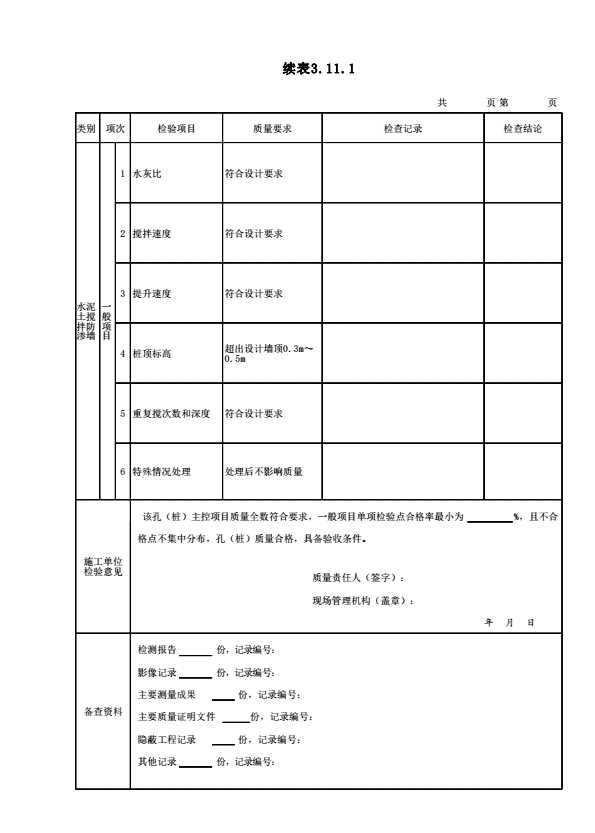 表格名称:表3.11.1 水泥土搅拌防渗墙单桩施工质量检验表