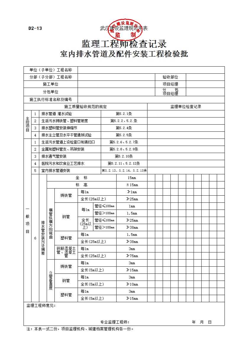 表格名称:D2-13 室内排水管道及配件安装检验批监理工程师检查记录