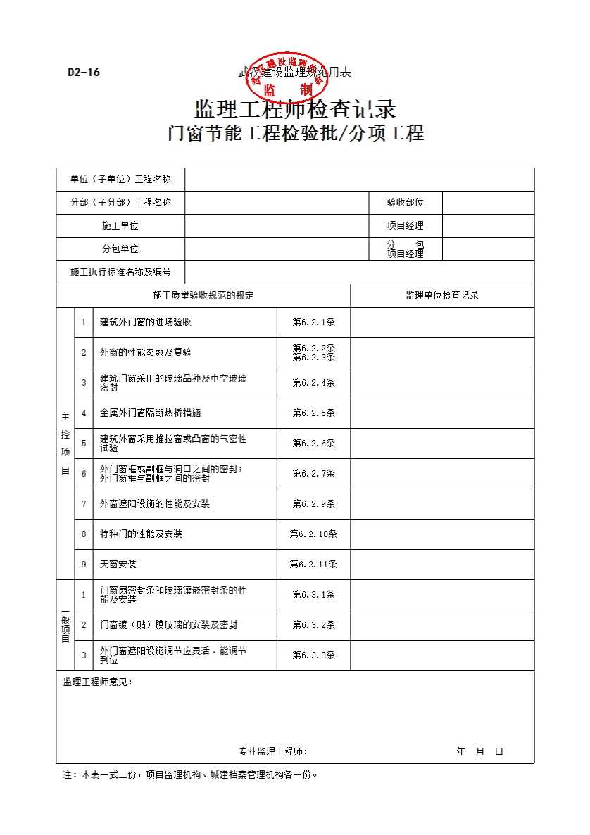 表格名称:D2-16 门窗节能检验批监理工程师检查记录
