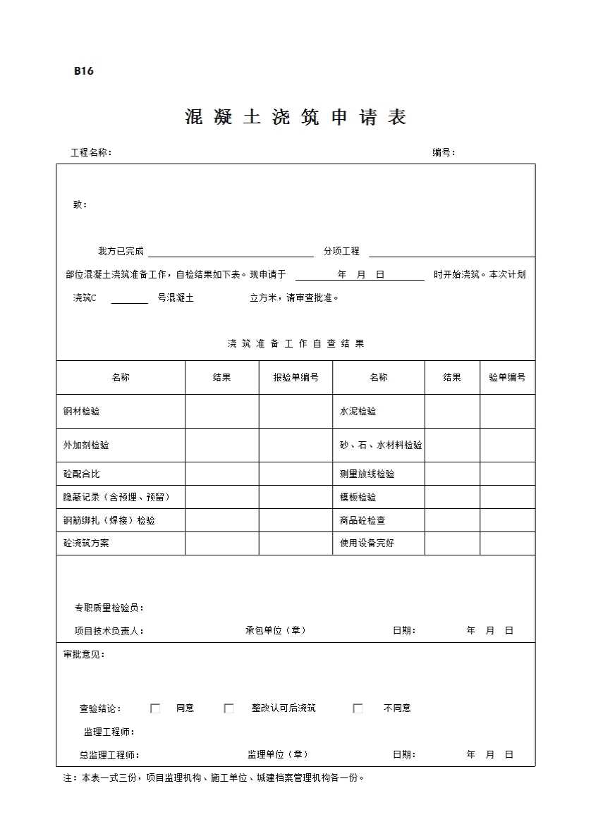 表格名称:B16 混凝土浇筑申请表