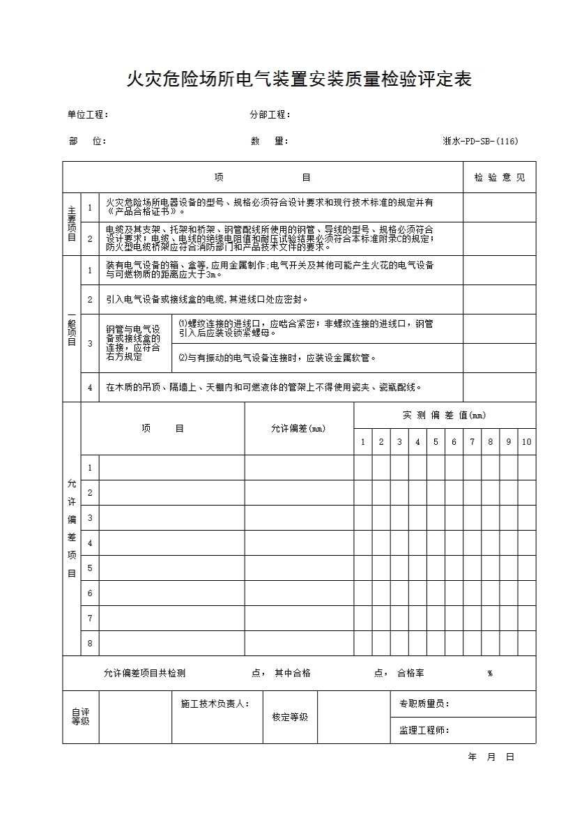 表格名称:116 火灾危险场所电气装置安装质量检验评定表