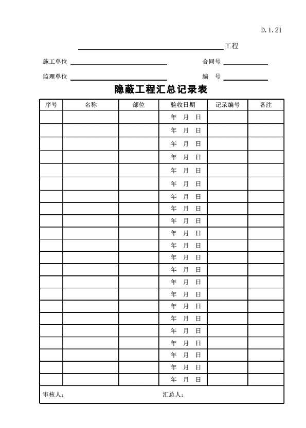 表格名称:D.1.21 隐蔽工程汇总记录表