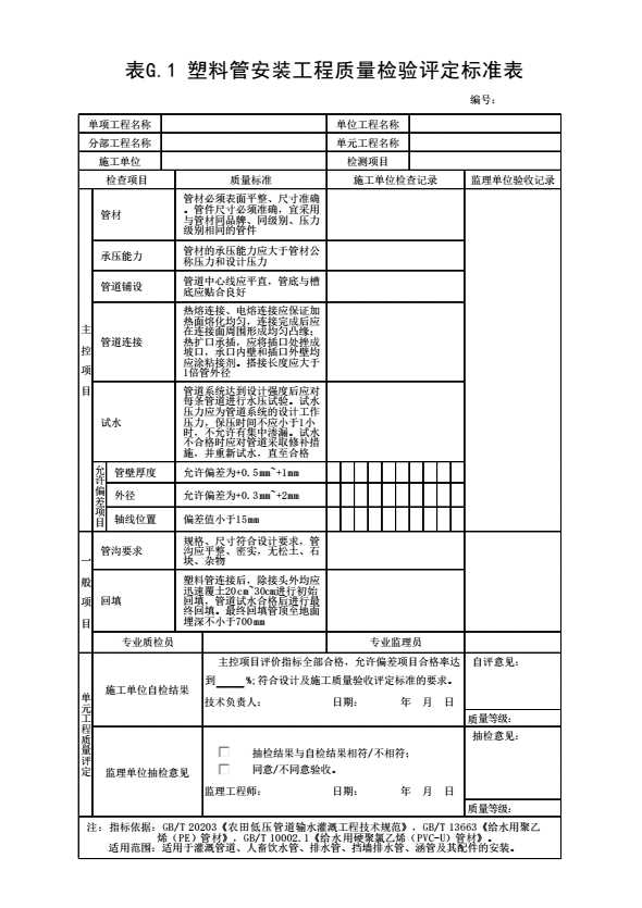 表格名称:表G.1 塑料管安装工程质量检验评定标准表