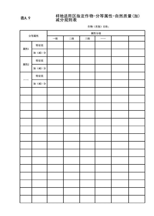 表格名称:表A.9 ×××样地适用区指定作物-分等属性-自然质量(加)减分规则表