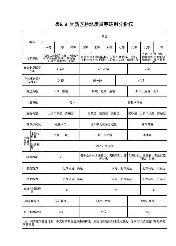 表B.8 甘新区耕地质量等级划分指标
