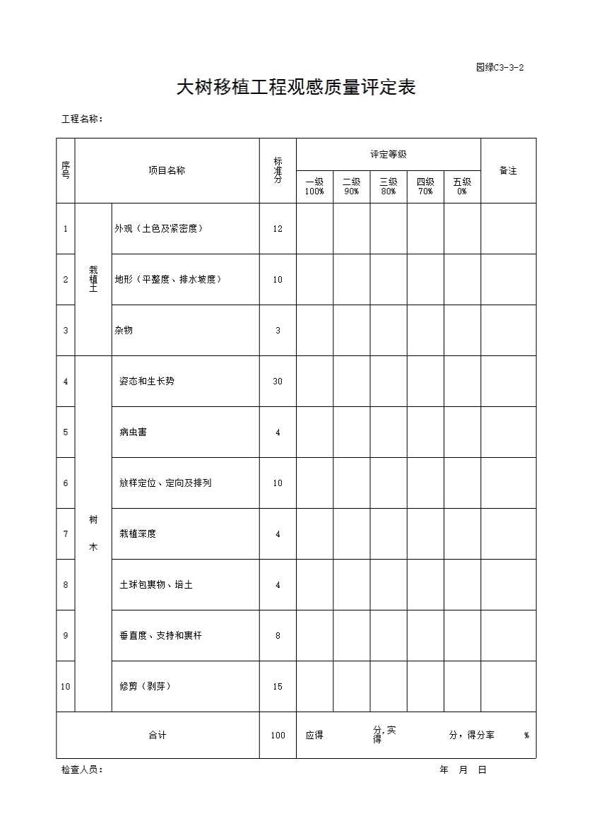 表格名称:园绿C3-3-2大树移植工程观感质量评定表
