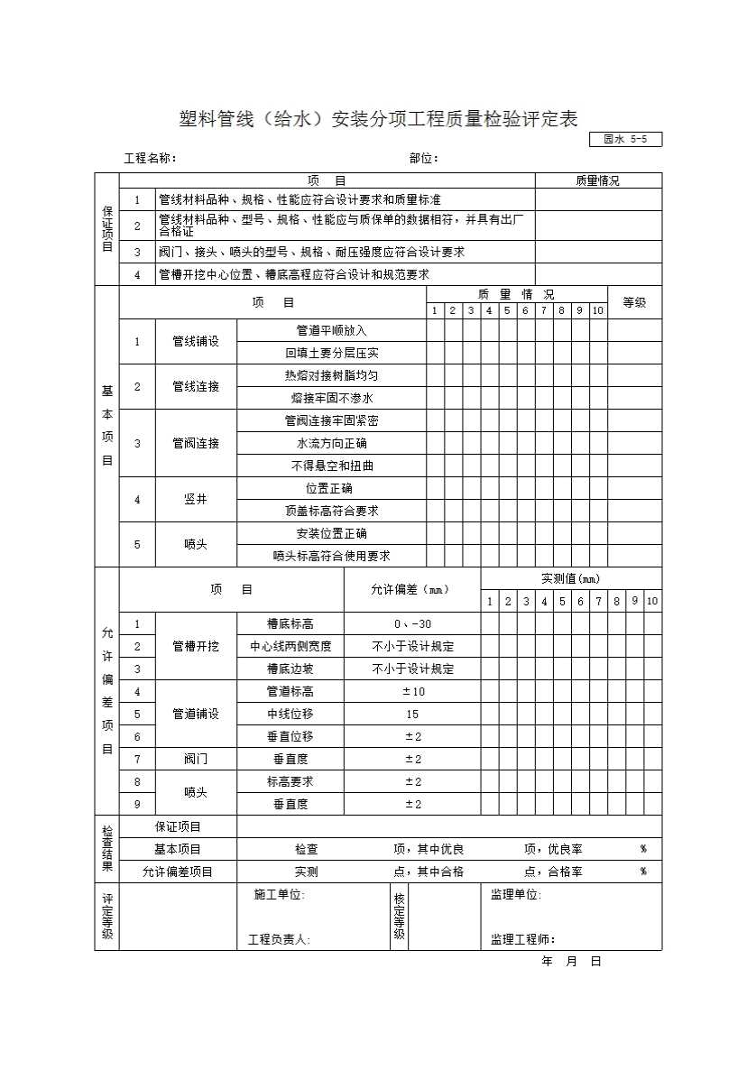 表格名称:塑料管线(给水)安装分项工程质量检验评定表