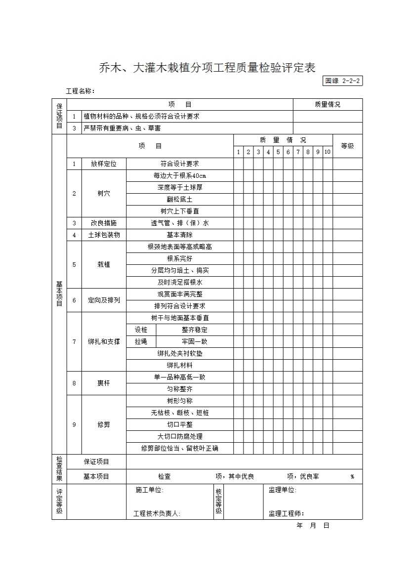 乔木、大灌木栽植分项工程质量检验评定表
