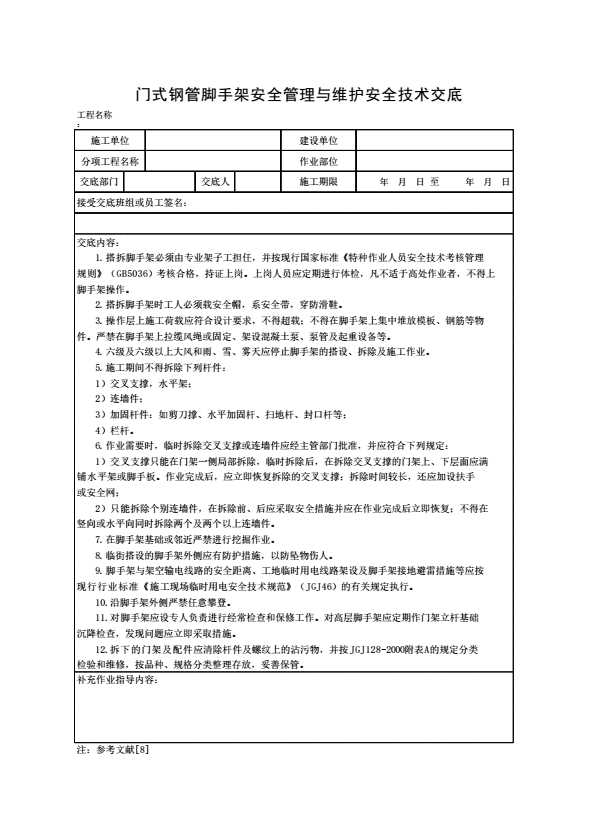 表格名称:门式钢管脚手架安全管理与维护安全技术交底