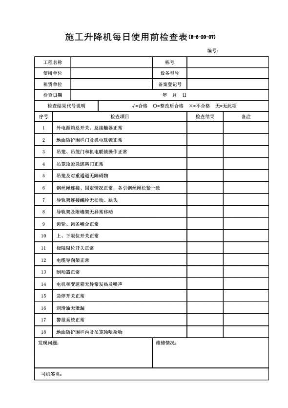 表格名称:施工升降机每日使用前检查表(B-6-20-07)