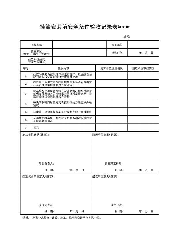 表格名称:挂篮安装前安全条件验收记录表(B-6-38)