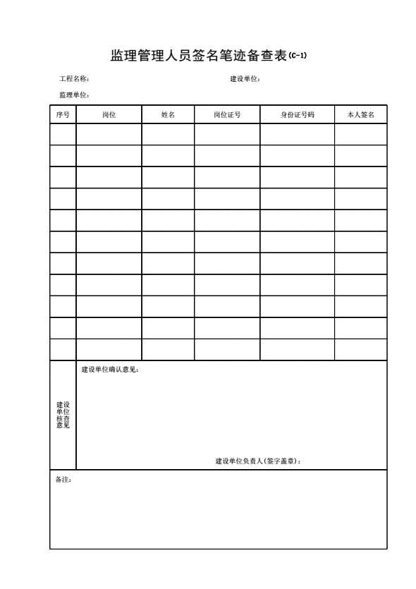 表格名称:监理管理人员签名笔迹备查表(C-1)