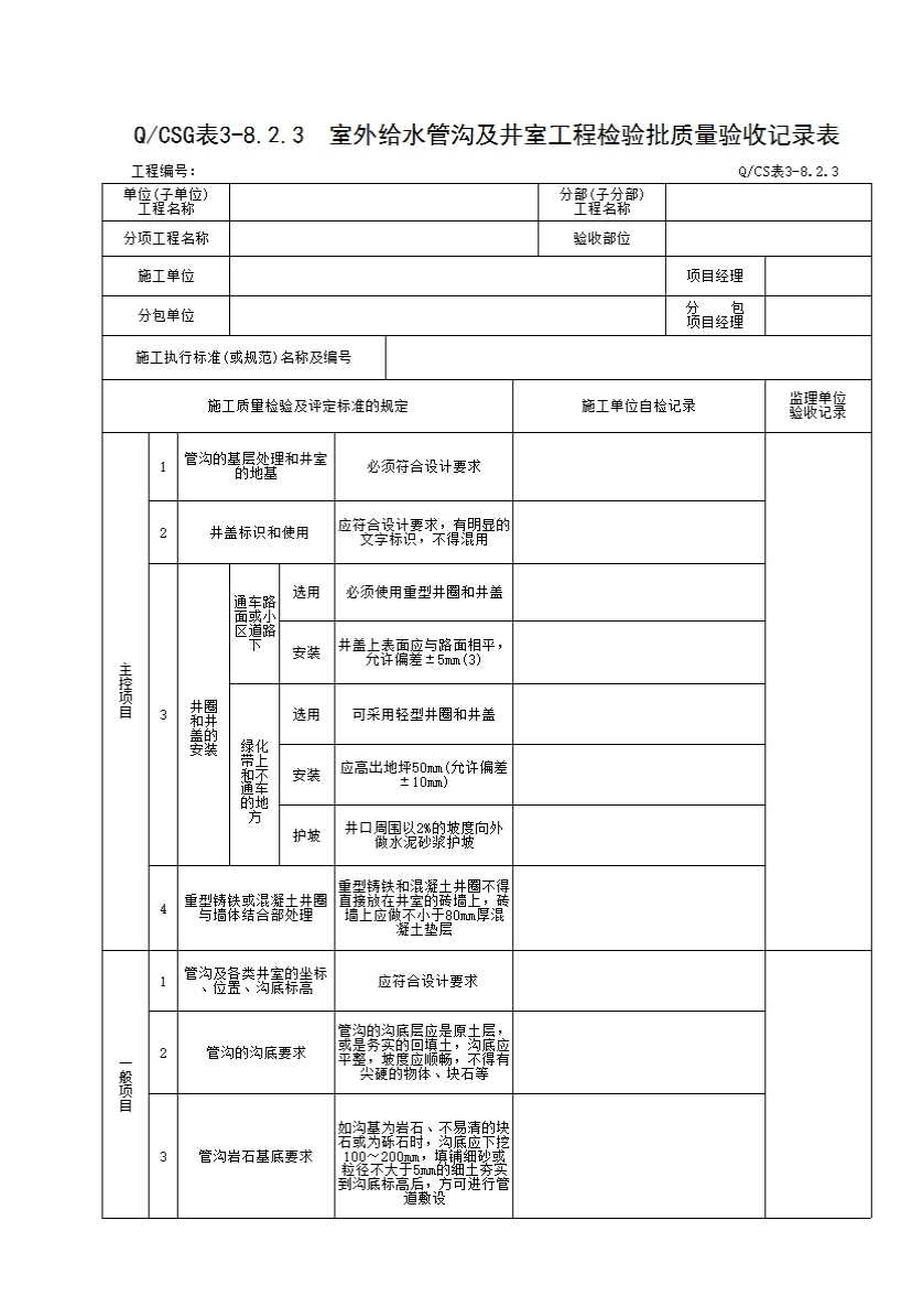 表格名称:QCSG 表 3-8.2.3 室外给水管沟及井室工程检验批质量验收记录表
