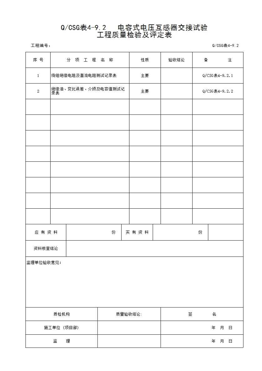 QCSG 表 4-9.2 电容式电压互感器交接试验 工程质量检验及评定表