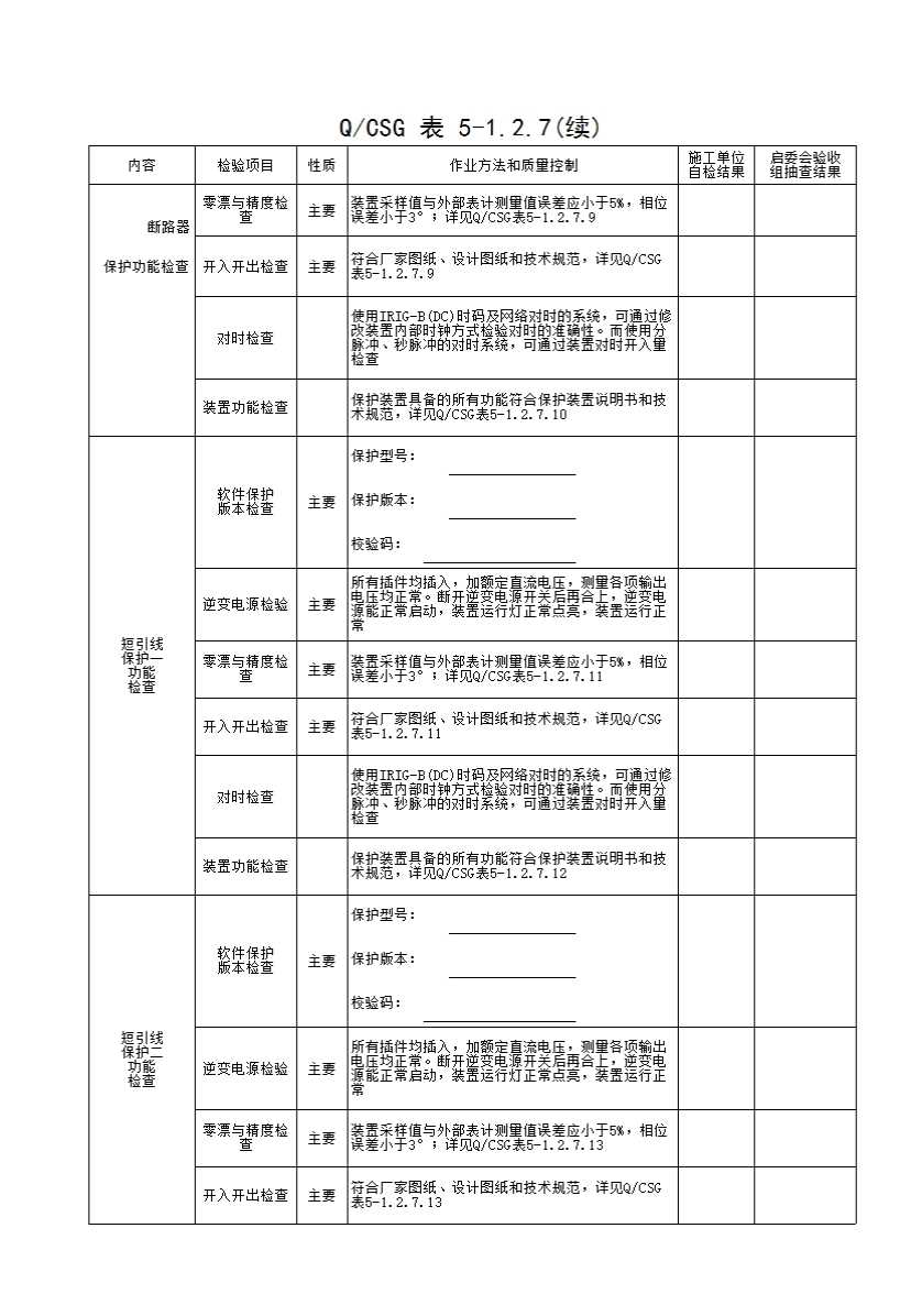 QCSG 表 5-1.2.7 500kV_____主变间隔 保护装置功能检查 分项工程质量验收记录表