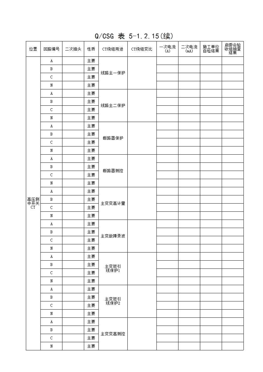 QCSG 表 5-1.2.15 500kV_____主变间隔 电流互感器通流 分项工程质量验收记录表