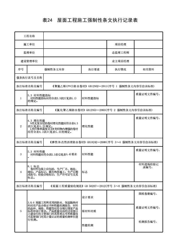 表格名称:表24 屋面工程施工强制性条文执行记录表