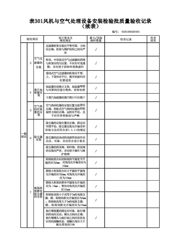 表格名称:020106020401 风机与空气处理设备安装检验批质量验收记录