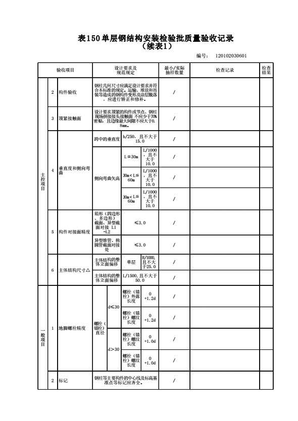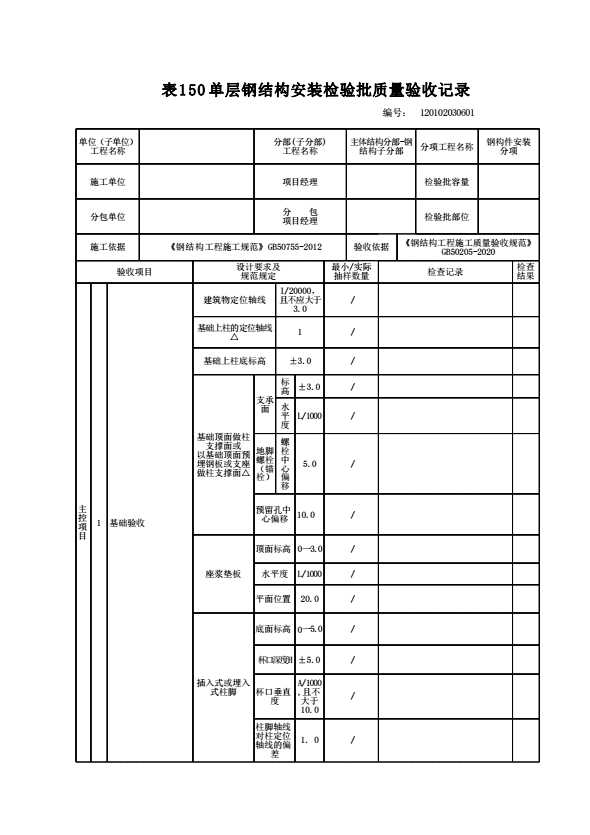 表格名称:120102030601 单层钢结构安装检验批质量验收记录