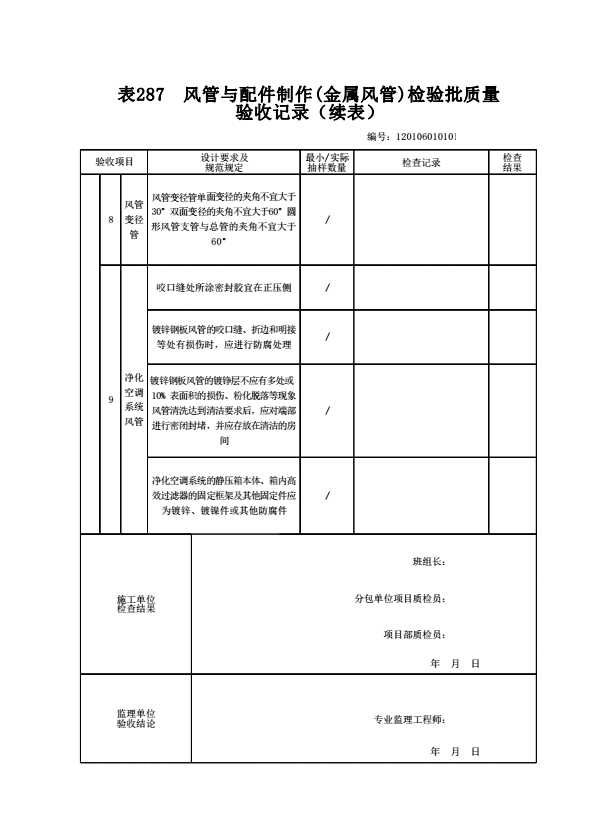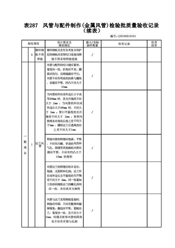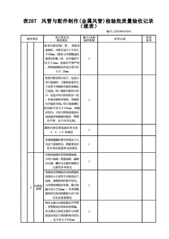 表格名称:120106010101 风管与配件制作(金属风管)检验批质量验收记录