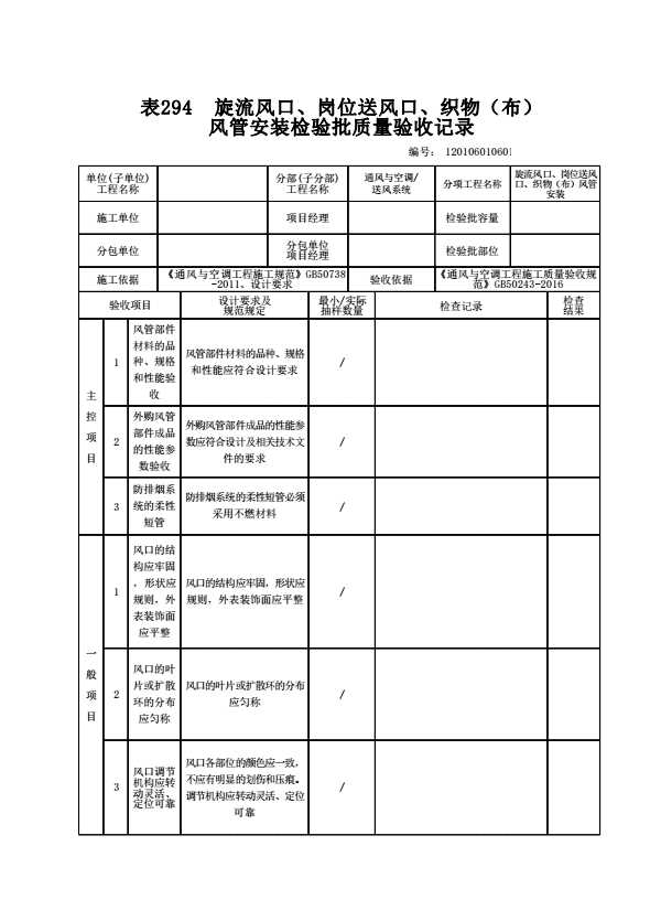 表格名称:120106010601 旋流风口、岗位送风口、织物(布)风管安装检验批质量验收记录