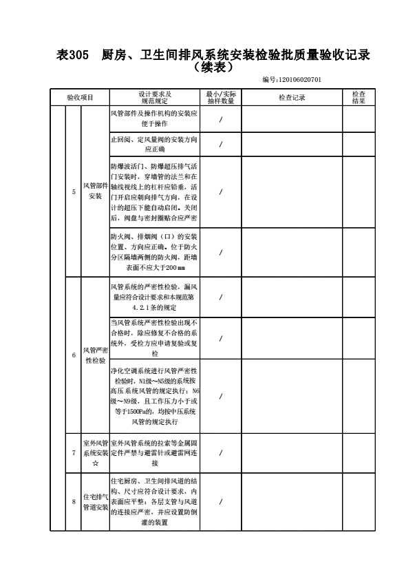 表格名称:120106020701 厨房、卫生间排风系统安装检验批质量验收记录