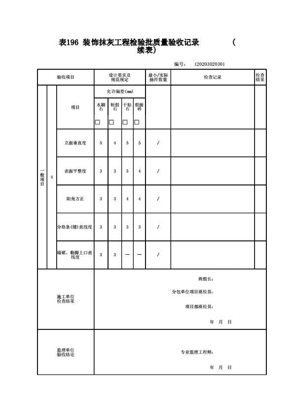 表格名称:120203020301 装饰抹灰工程检验批质量验收记录